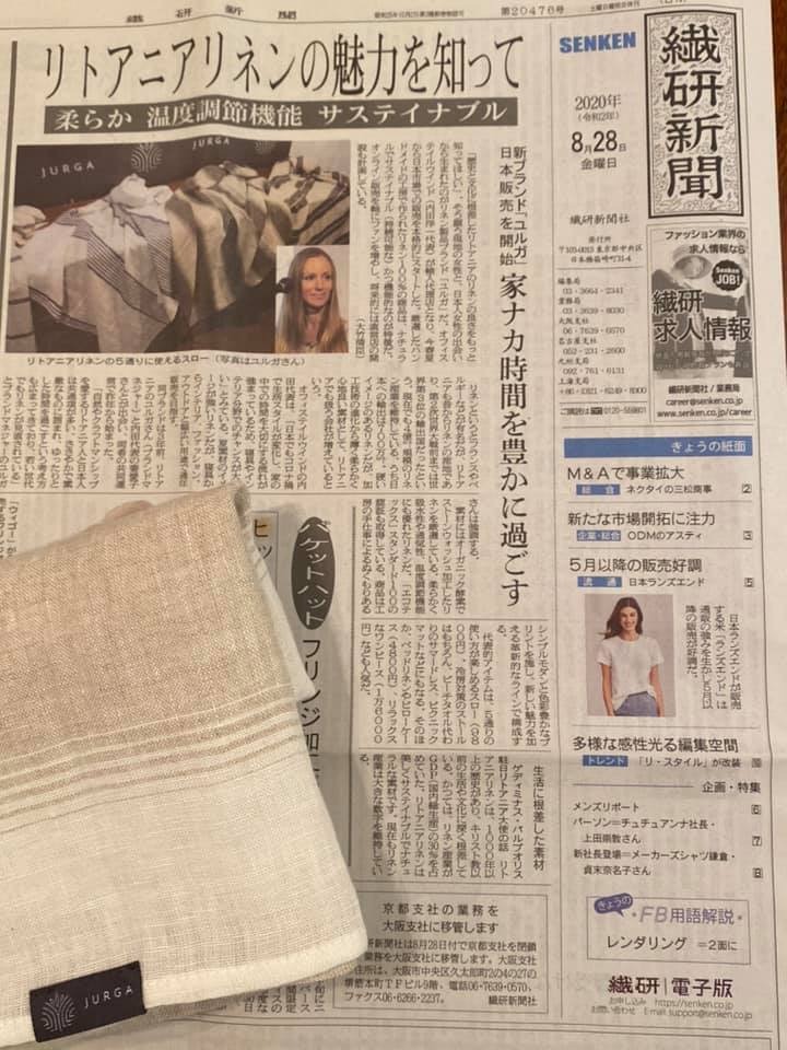 繊維・ファッション業界紙の最大手、繊研新聞(繊研新聞社)にて、リトアニアリネンの魅力を伝えるJURGA(ユルガ)を一面のTOPでご紹介いただきました。